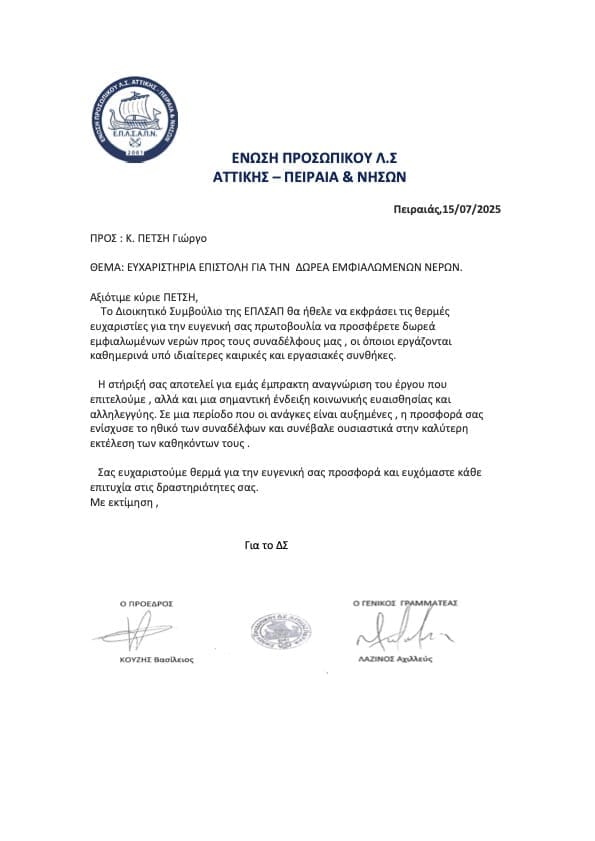 With a sense of gratitude and respect, Dport Services donated bottled water to the Hellenic Coast Guard – Attica, Piraeus & Islands Division, recognizing the valuable work carried out daily by the men and women of the Force.