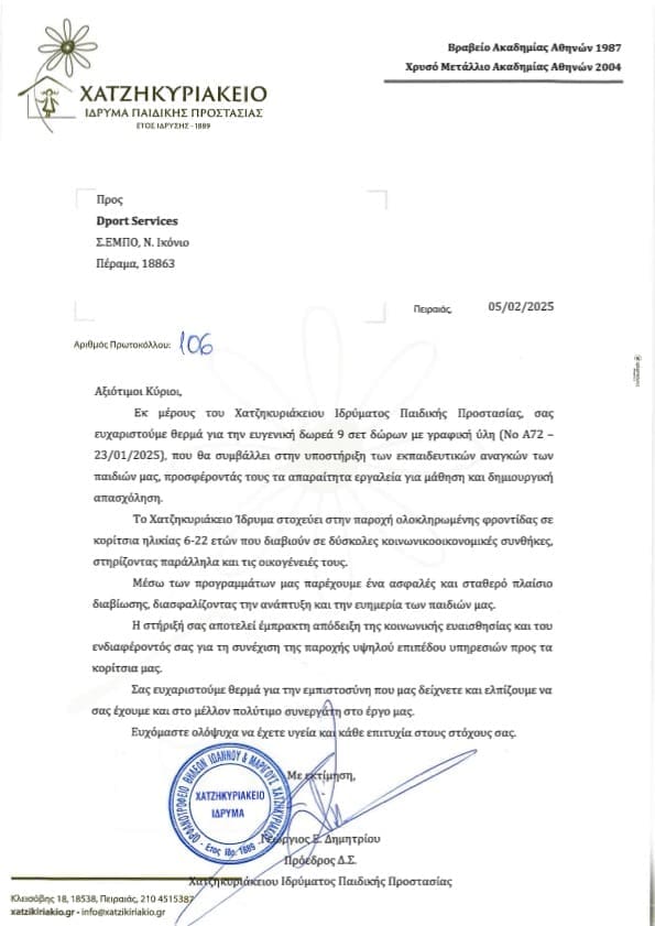 Η DPort, στο πλαίσιο της κοινωνικής της ευαισθησίας, στηρίζει το Χατζηκυριάκειο Ίδρυμα προσφέροντας σετ γραφικής ύλης, ενισχύοντας το έργο του Ιδρύματος και καλύπτοντας τις εκπαιδευτικές ανάγκες των παιδιών. Με την προσφορά αυτή, συμβάλλει ουσιαστικά στην παροχή των απαραίτητων εργαλείων για μάθηση και δημιουργική απασχόληση.
